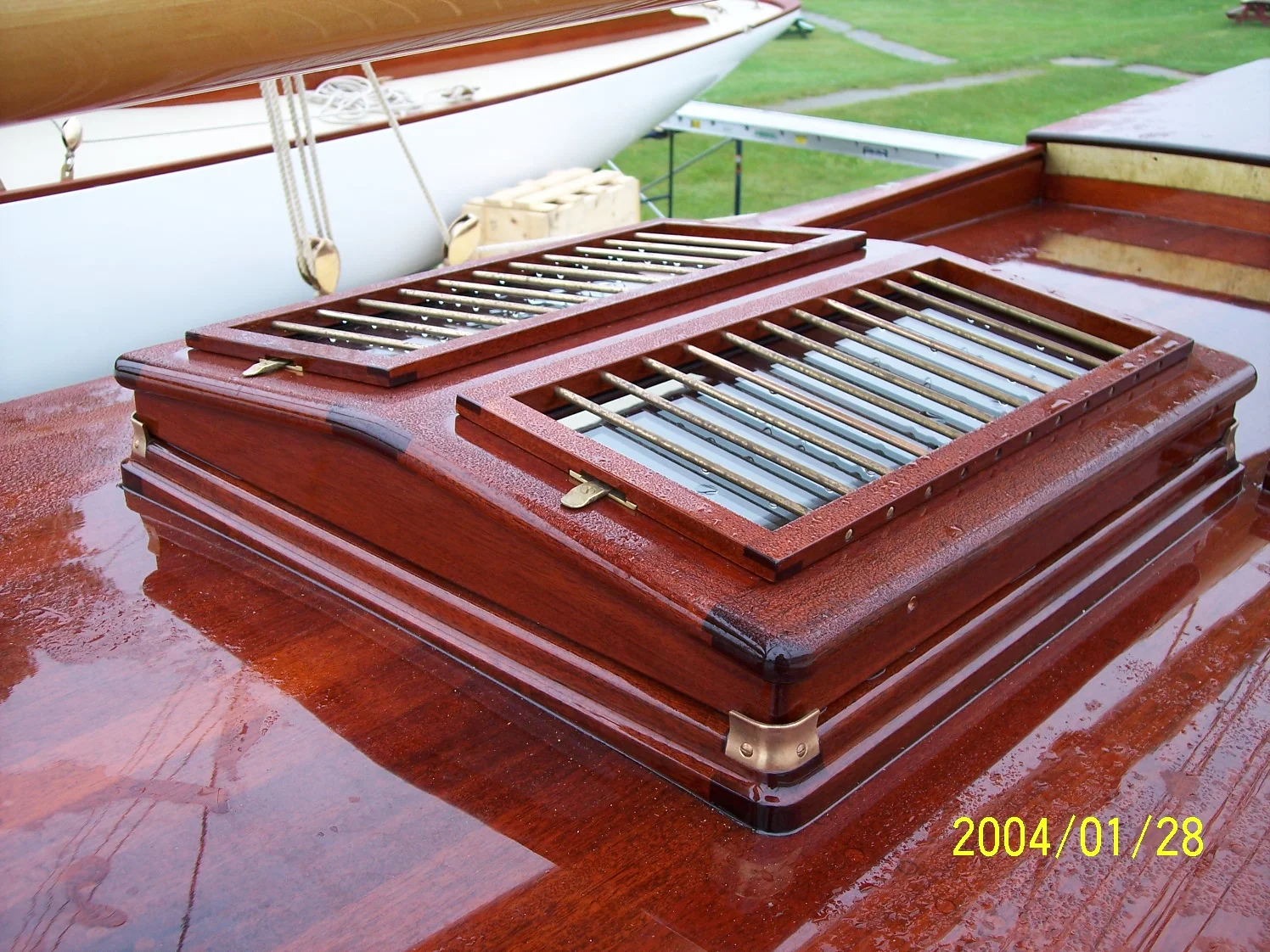 Mahogany skylight hatch on a Herreshoff Buzzards Bay 30 cabin trunk